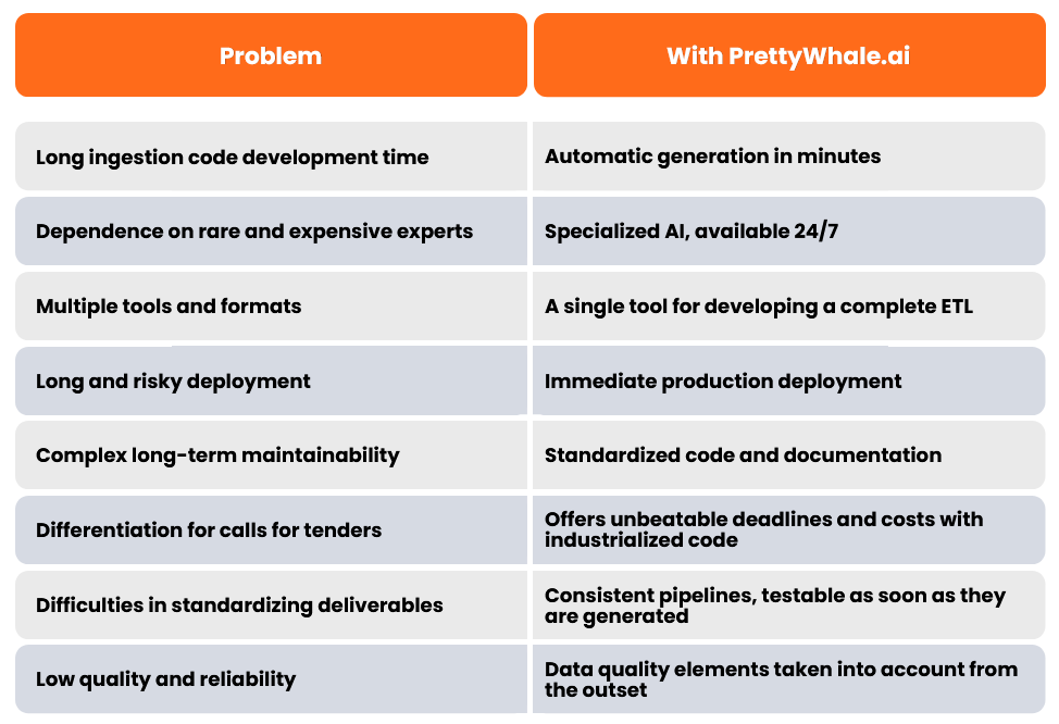 By automatic generation of production-ready pipelines in minutes — delivers complete, executable, and documented code, 24/7.